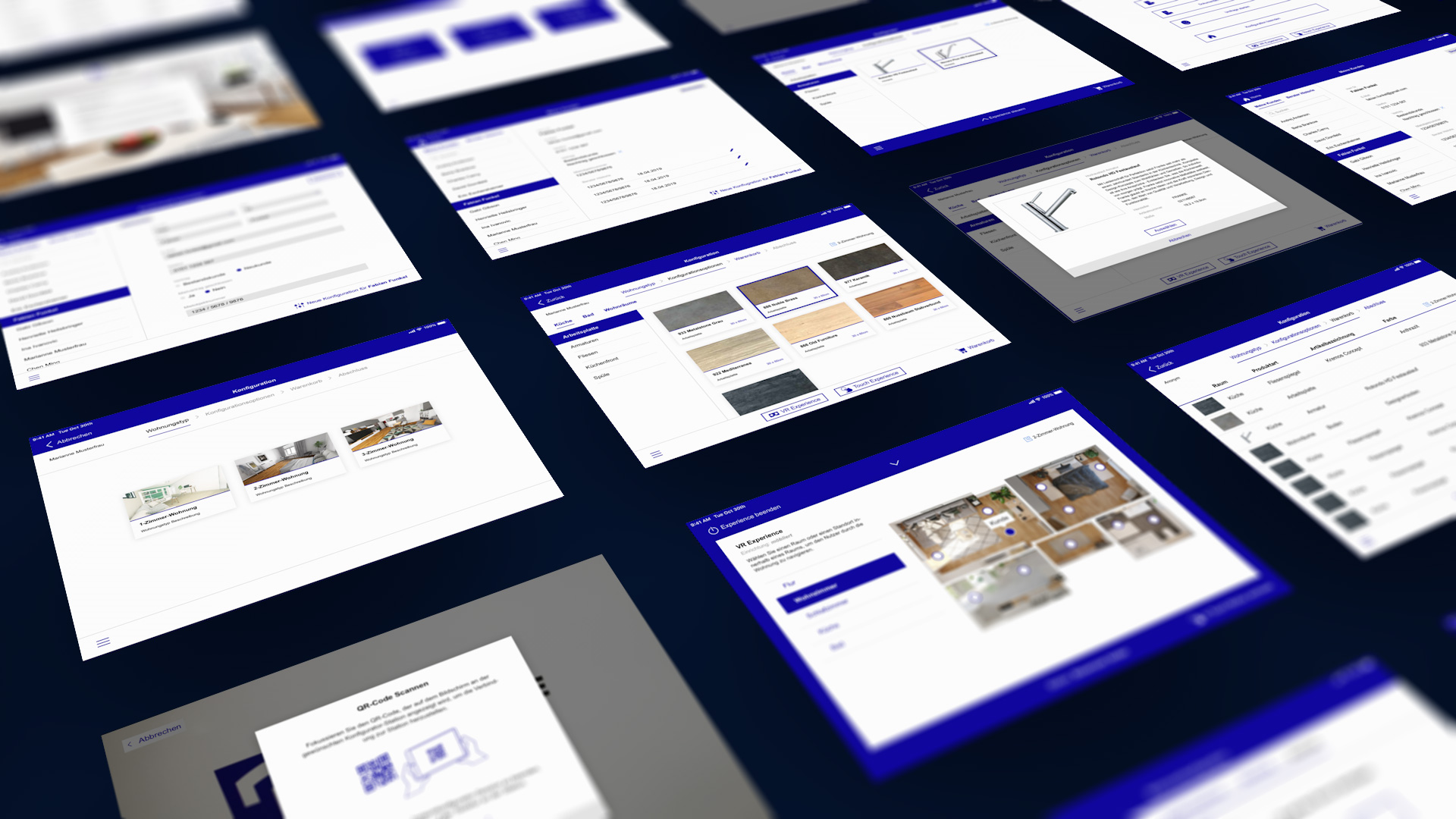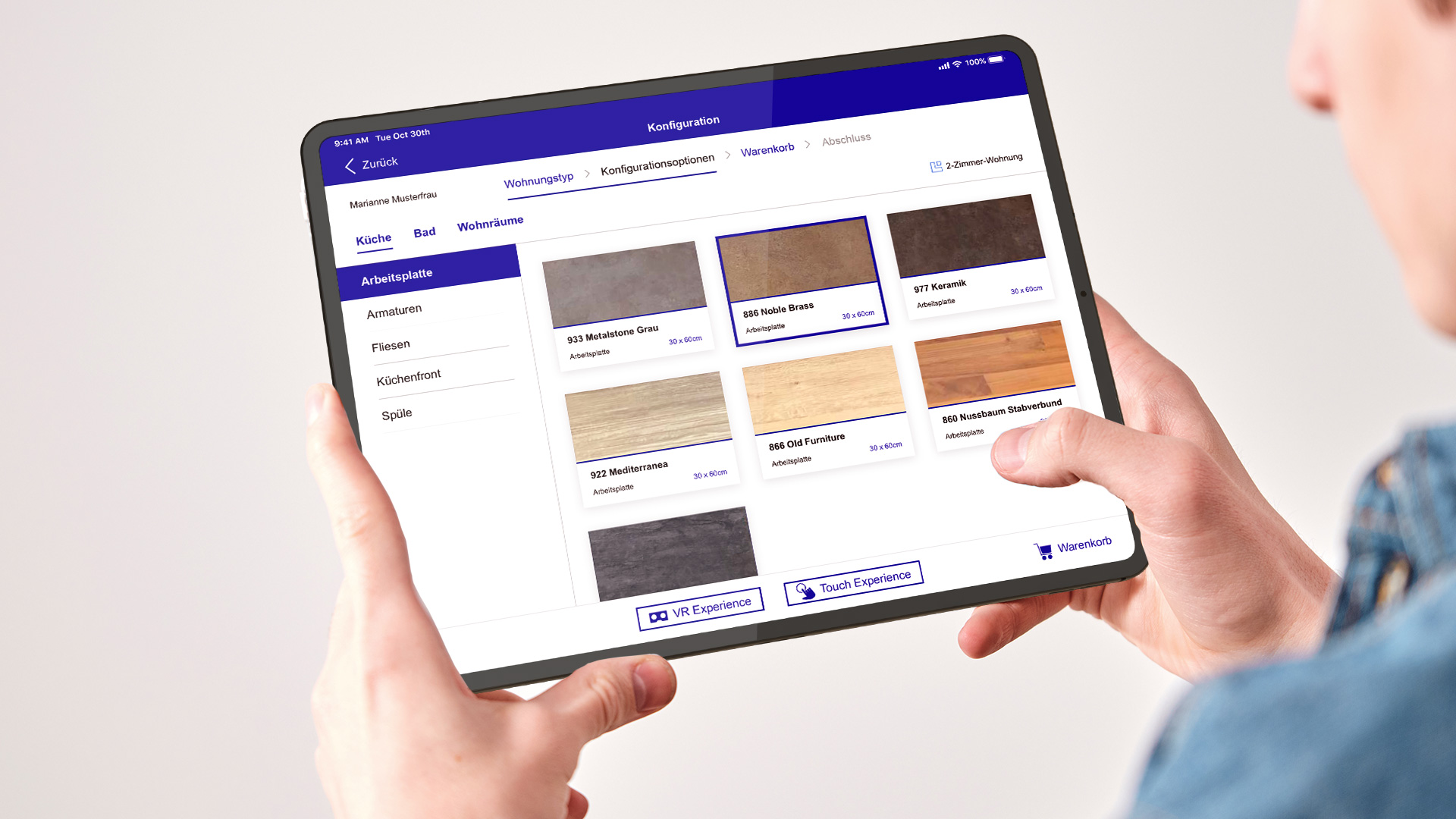 Using the consultant app, sales staff can select items out of a product portfolio to add to the configuration. In a showroom situation, the selection of flooring options for example could be accompanied by looking at real samples of the materials.