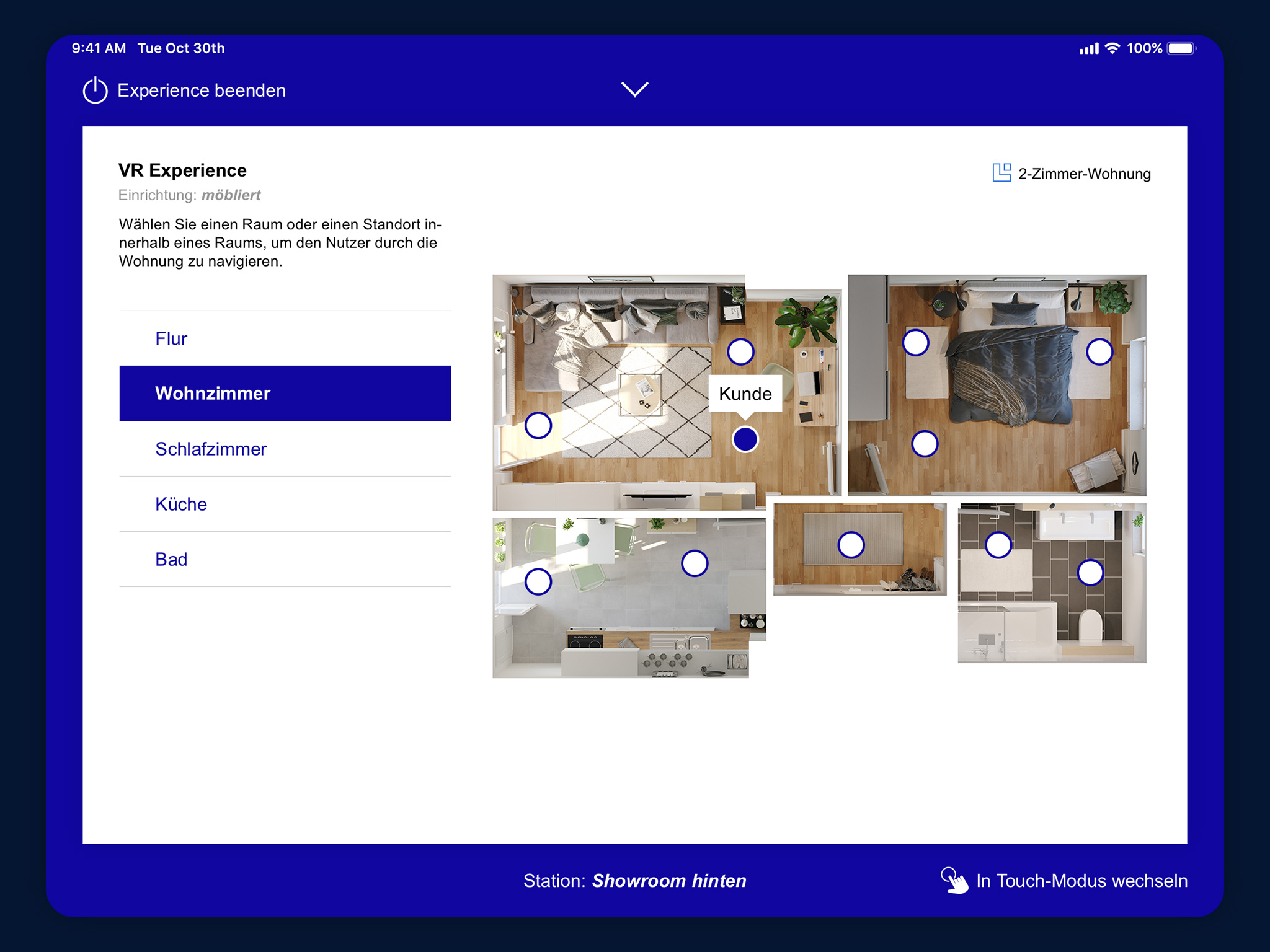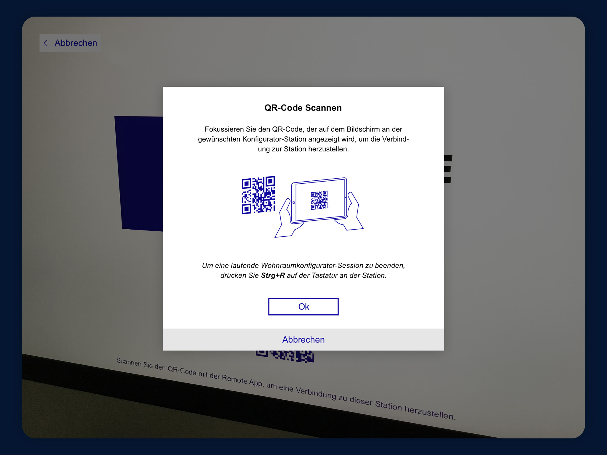 The VR and touch experience can be started and operated easily from the Consultant App. Synchronization of the current configuration session between the app and an experience station is achieved via simply scanning a QR code.