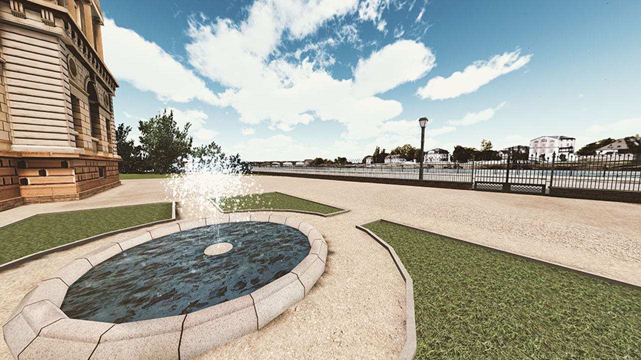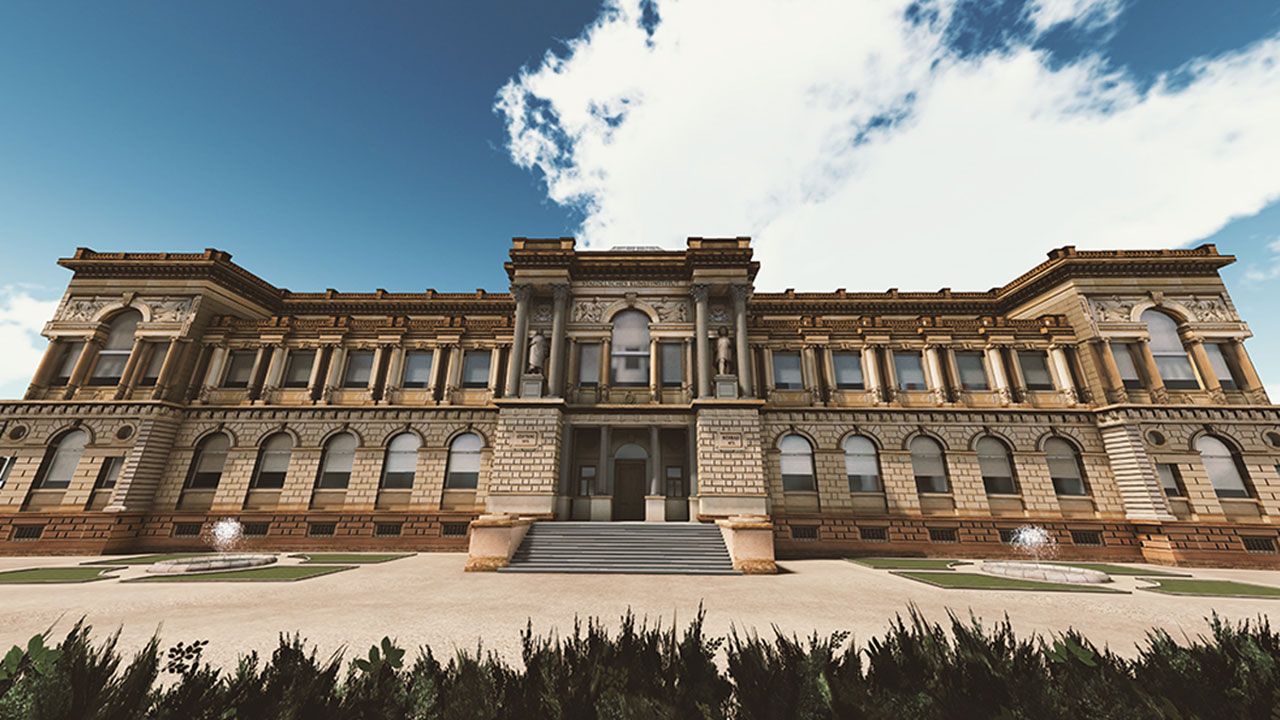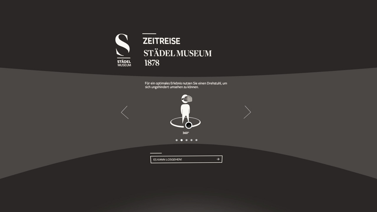 Standing in front of today's Städel after starting the VR experience, users travel back in time to enter the museum in its opening year of 1878. There they have the possibility to explore over 600 paintings on two floors. Users can freely move through the 15 fully reconstructed exhibition rooms on their own or choose between two audio-guided tours. Each painting can be examined in detail, conveniently sliding right in front of the user, on the click of a button. A low-key UI and atmospheric sound deepen the immersion while providing helpful tools to navigate through the experience.