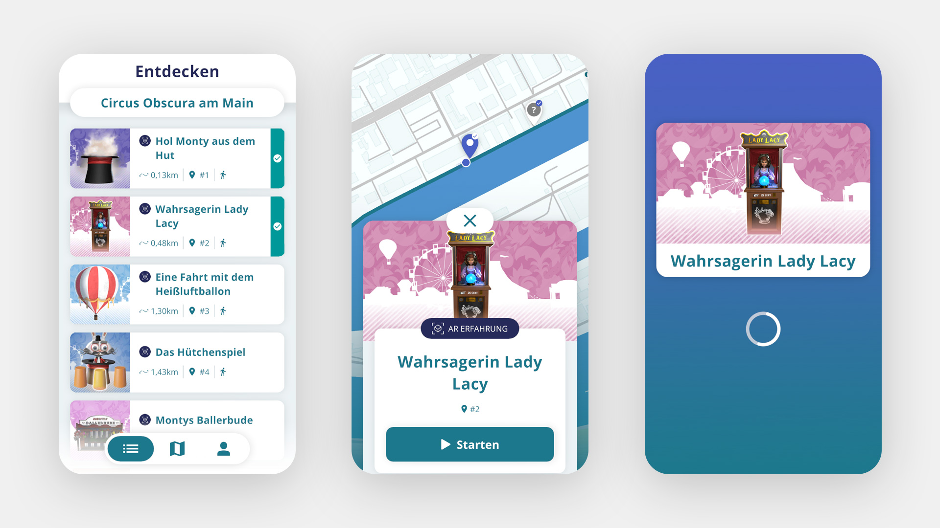 As demand for decentralized outdoor events and activities grew in the last years and more and more smartphones are capable of running sophisticated Augmented Reality experiences, NMY set out to design a white label software solution for virtual tours and Mixed Reality experiences. NMY UnSeen is aimed at various clients and applications, from virtual outdoor museums or trade fares to educational tours or city marketing initiatives. Each UnSeen tour consists of any number of points of interest, each featuring linear or interactive content such as Augmented Reality experiences, videos or audio recordings. After a brief onboarding process, players choose and download one of the tours presented in an app built with UnSeen. They can then use the app to navigate to the entry of the tour and start the experience at the first point of interest. The tours can be set up to be explored one stop after the other or in a non-linear fashion. By exploring each of the tours stops and experiences, players progress along its route and complete it step by step. Besides the main stops, initially hidden points of interest can be discovered using a virtual scanner and collectibles and trophies can be earned along the way. To demonstrate the frameworks features, NMY created the Circus Obscura tour in Frankfurt, in which players can explore a virtual circus and its slightly run-down attractions accompanied by the quirky circus director Monty the rabbit.