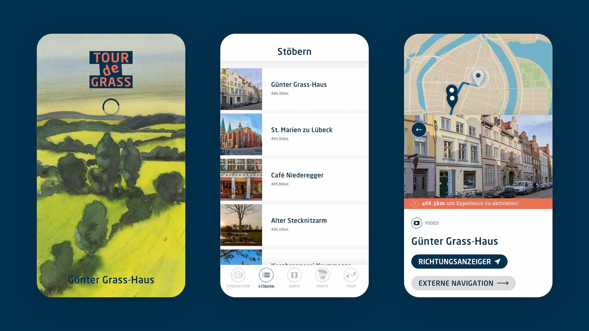 Based on UnSeen, NMY together with the Günter-Grass Haus in Lübeck, created the Tour de Grass app. It features a virtual tour with 24 stops along the Elbe-Lübeck-Kanal in the Stecknitz region, that allows users to experience German artist and writer Günter Grass' work along the landscape it was created in.