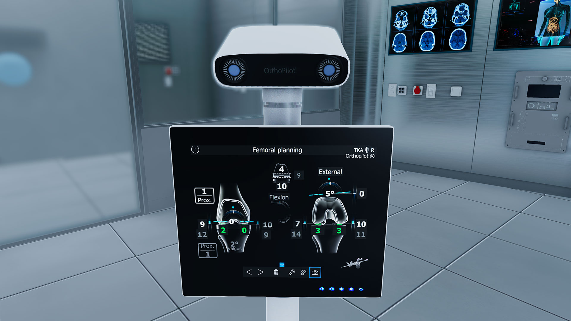 Information that would normally be communicated via the OrthoPilot®'s screen is displayed as a spatial UI around the knee in VR.