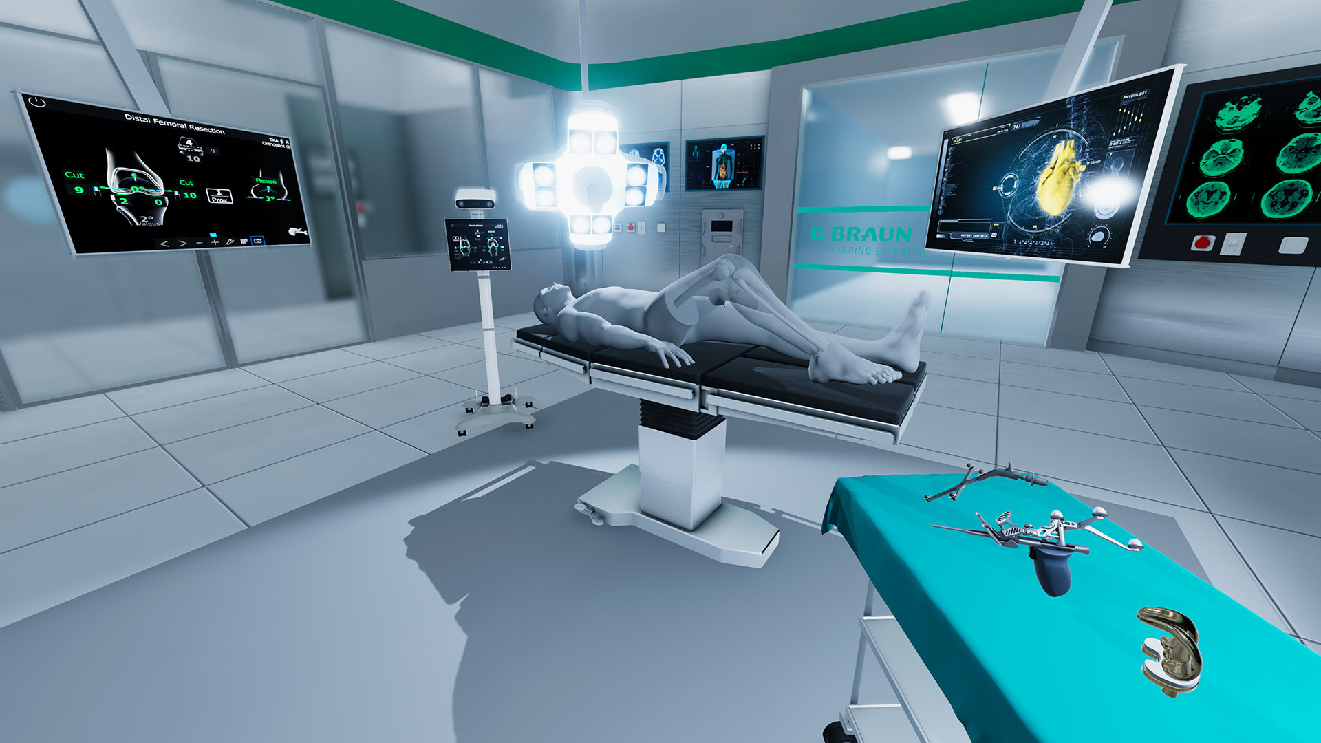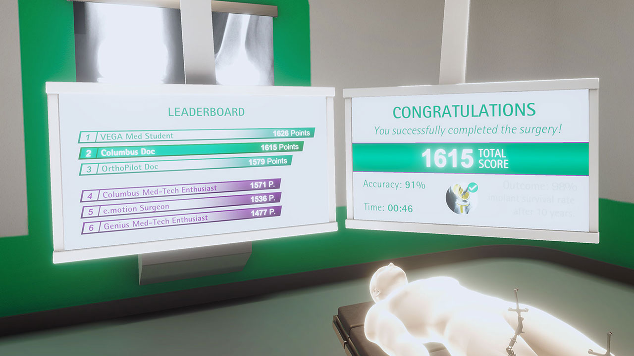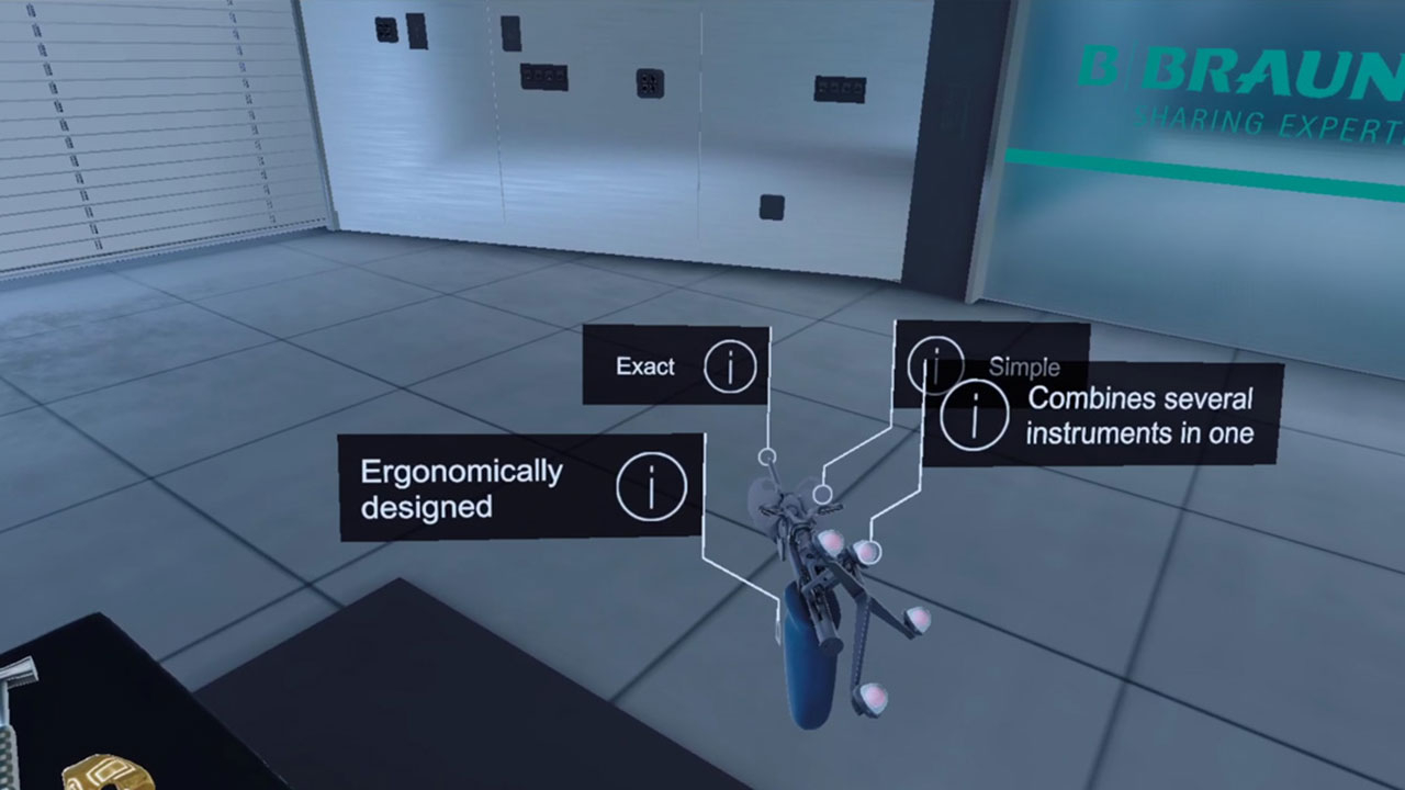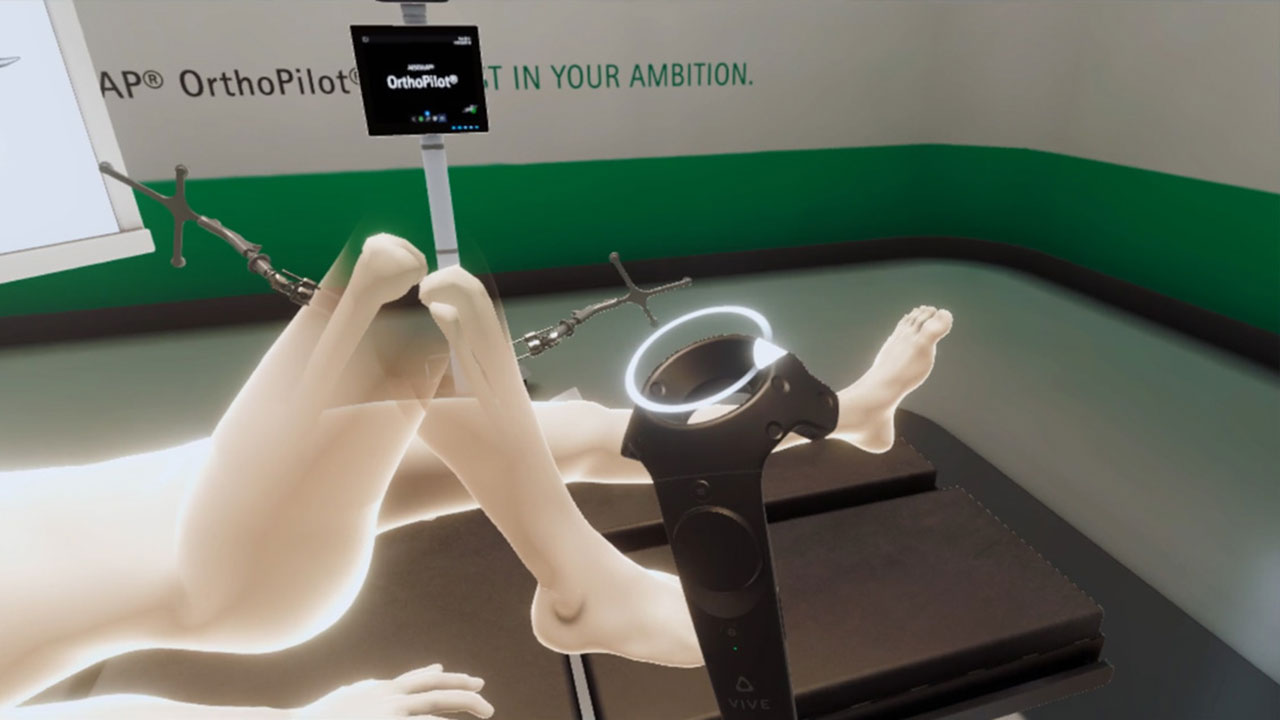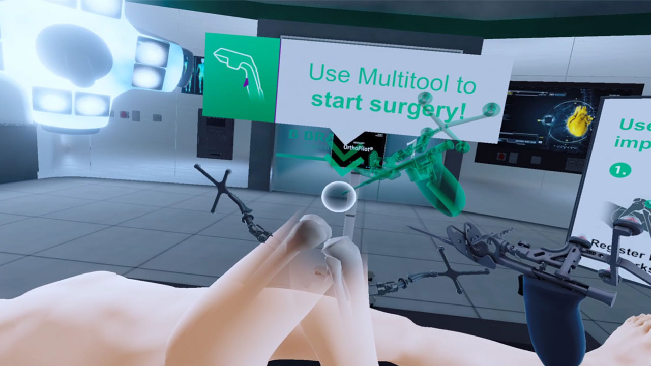 To better communicate the novel and user friendly surgical procedures introduced with the OrthoPilot® system in in-house demos and on trade shows, B. Braun Aesculap was searching for a product presentation that went beyond mere PowerPoint slides or videos. The solution was a VR simulation that had to both accurately represent the various steps of the surgery as well as enable users, that had never used a VR headset before, to complete the whole procedure during a limited time frame. The audience should also learn about the features and benefits of the system, while still having some fun with the experience. To achieve this goal, the surgery process was drastically simplified for the VR experience and game mechanics were used to guide the users and encourage them to complete the simulated tasks with as much precision as possible.