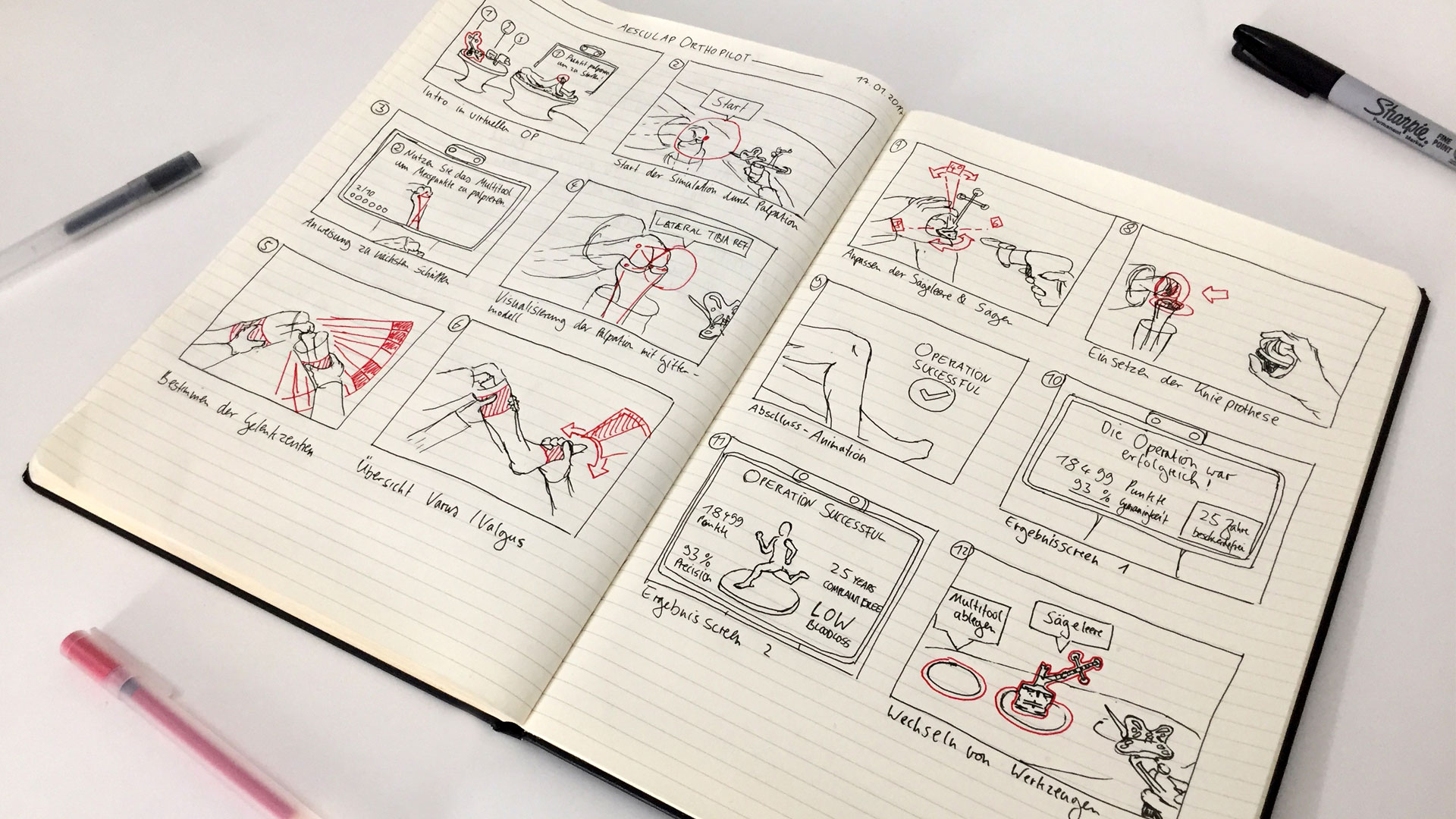 After an initial workshop with the OrthoPilot® product team to understand the system as much as possible, I set out to create first sequence diagrams and scribbled a storyboard to define the rough scope and segments of the experience.